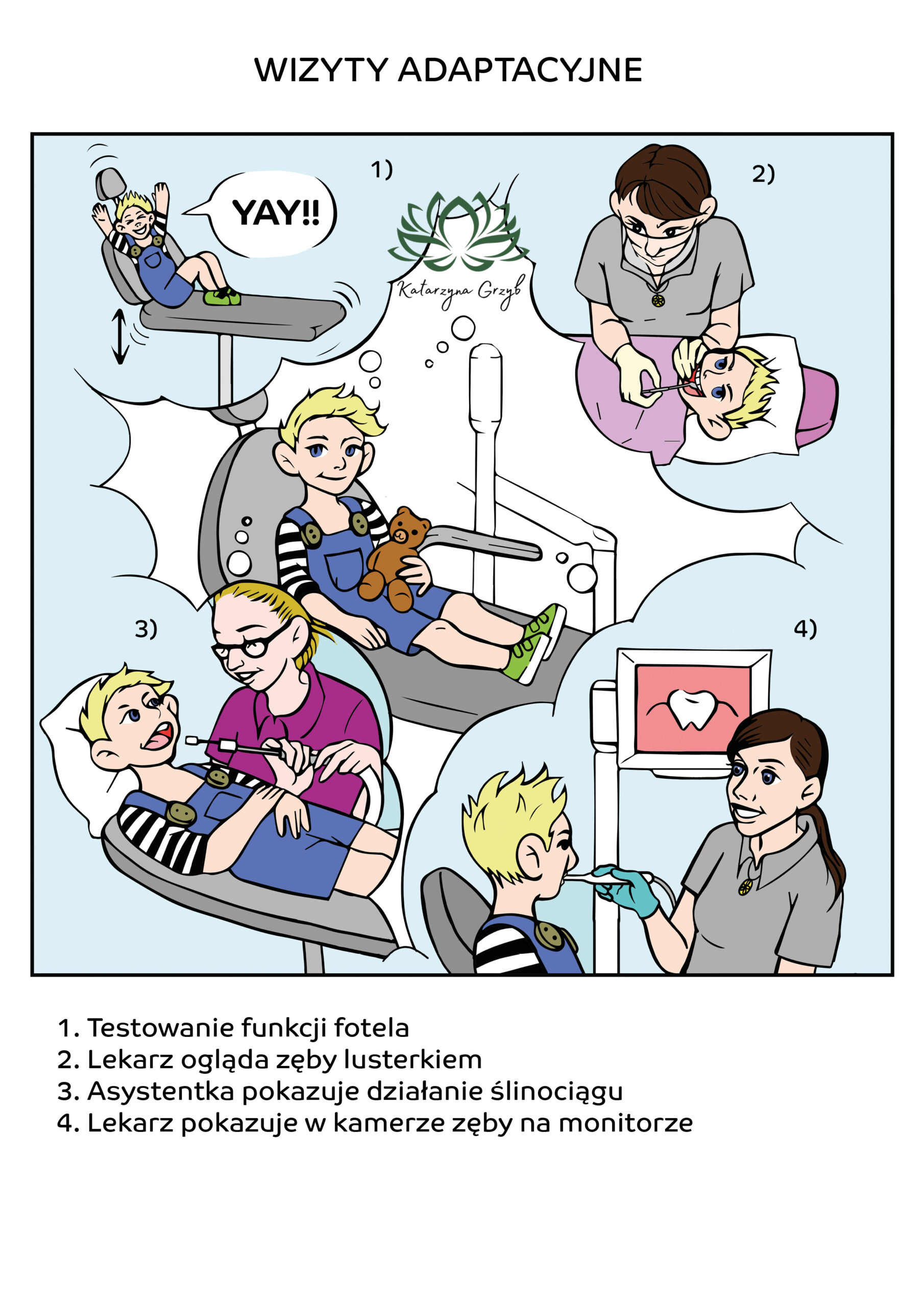 To wizyty, które odbywają się u lekarza lub higienistki stomatologicznej. Polegają na zapoznaniu dziecka ze sprzętem jakiego używamy na wizytach, z działaniem fotela i generalnie z całą atmosferą wizyty. Dziecko może zobaczyć jak działa ślinociąg, spluwaczka, jak poleruje i czyści się zęby szczoteczką, może pojeździć na fotelu w górę i w dół, może wręcz samo obsługiwać taki fotel. Na takiej wizycie możemy obejrzeć również zęby w powiększeniu na ekranie monitora za pomocą kamery wewnątrzustnej.